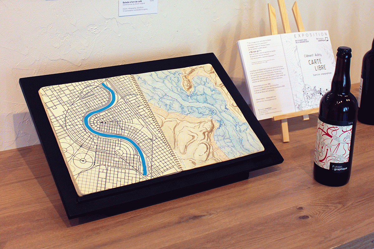 Cette exposition à vu le jour suite à la proposition de Pierre-Yves Jaouen de la La Brasserie Graphique qui souhaitait créer une nouvelle bière nommée l’Utopographique ! Une IPA, qui évoque le voyage*, trouble et typée, comme le travail présenté ici. Une incitation à quitter sa zone de confort pour une zone de plaisir, visuelle et gustative.